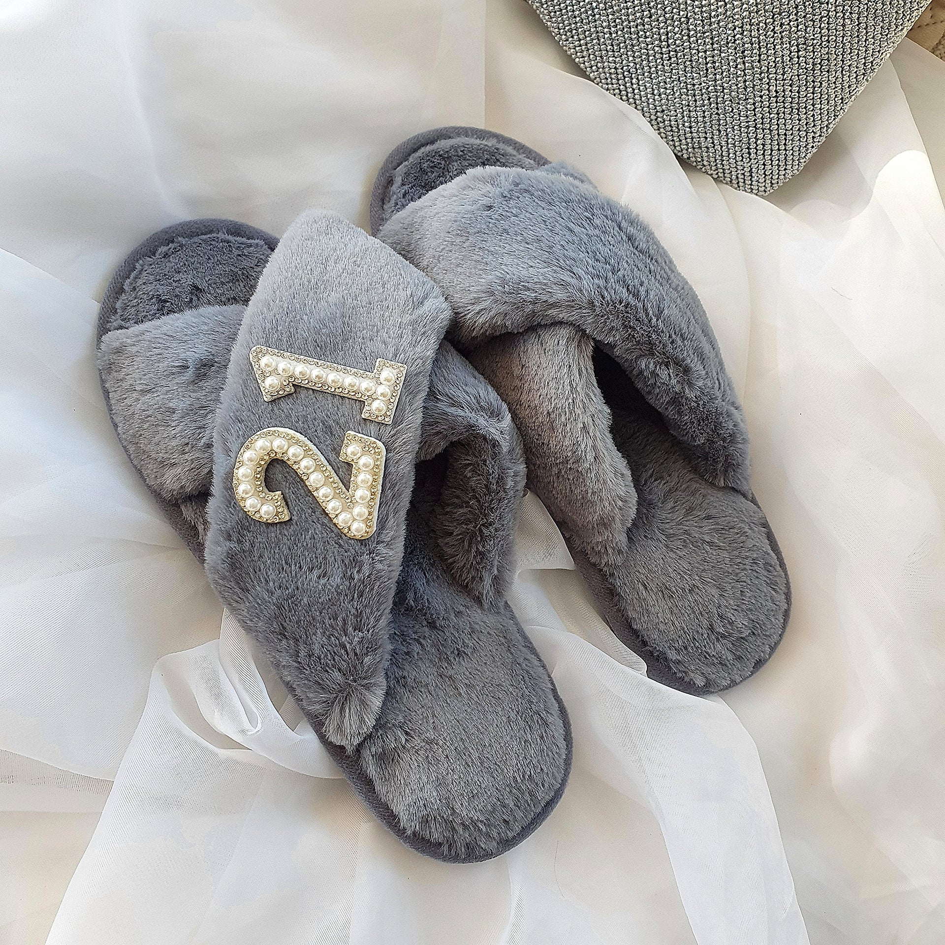 Our BIRTHDAY grey fluffy slippers with silver diamante are the perfect bling-bling accessory for a treat for yourself or the perfect gift for a bestie on her special birthday! Our slippers are super soft, featuring a flattering and comfy crossover design. Each number is made up of sparkling diamante jewels and creamy pearl beads.